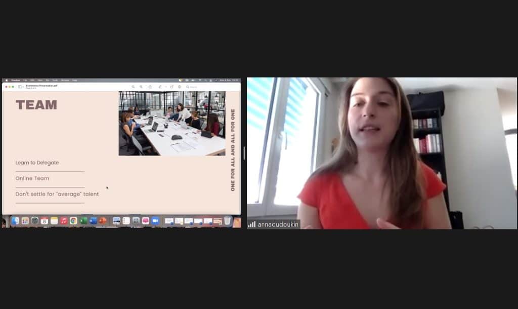 10:15 – Ms. Anna Dudukin speaks about the importance of delegation when starting a business. She has 12 people on her team and has only seen 3 of them. She feels it is best to delegate to a virtual team for expertise from freelancers.